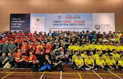 The teams of the FIRST LEGO League (FLL) Malaysia 2022/2023 competition together with Ybrs. Encik Zainuren bin Mohd Nor, Director of Sport, Arts and Co-curricular Division, Ministry of Education Malaysia